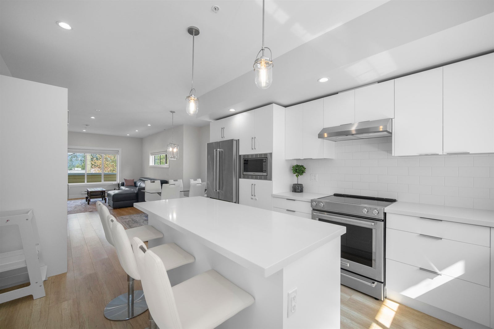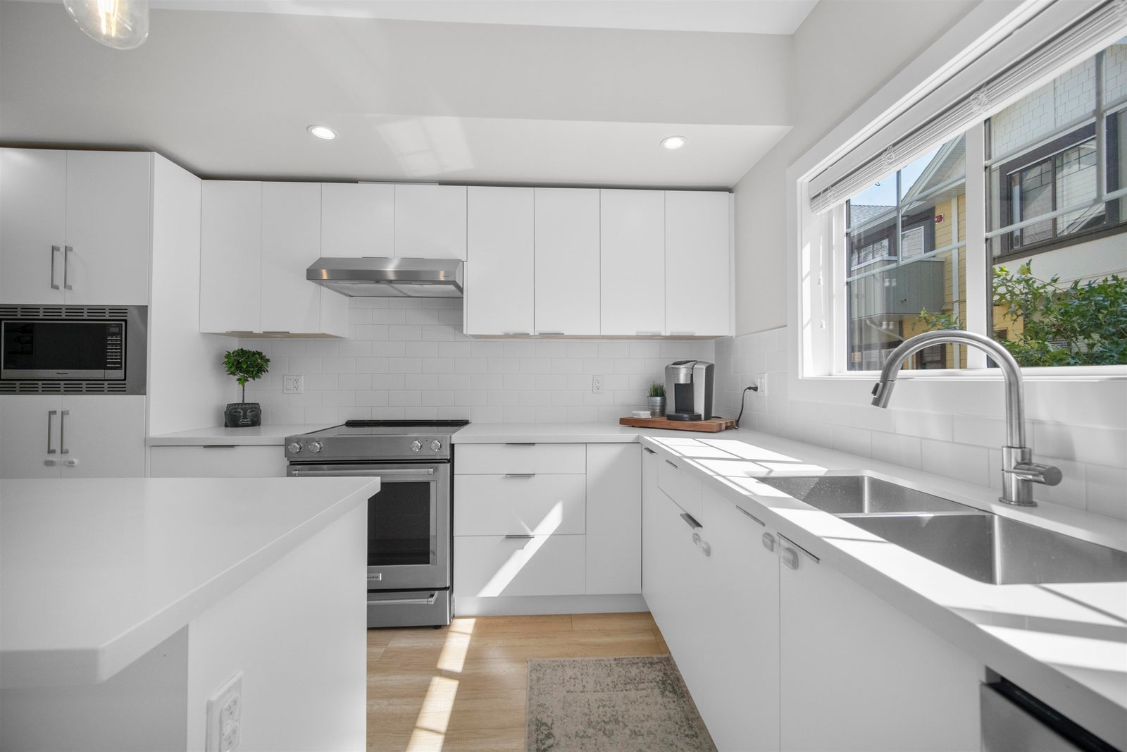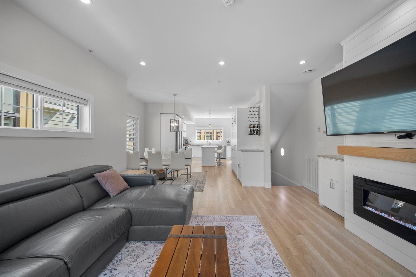 Experience the pinnacle of urban living in the largest home at Sophia Living-1,430 sq ft of stylish comfort in the heart of Port Moody Centre. This spacious 3 Bed, 3 Bath corner townhome offers soaring 9', and luxury vinyl floors throughout. A chef-inspired kitchen features quartz countertops, a generous island, and extended cabinetry with granite-topped built-ins in the dining and living areas. Cozy up by the custom fireplace wall or step out to a full-width balcony with panoramic mountain and partial inlet views. The upper level hosts three spacious bedrooms, including a serene primary with built-ins and a sleek ensuite. Unbeatable location near Moody Centre SkyTrain, Brewery Row & Rocky Point. TWO side-by-side parking stalls included, a storage locker and 2 allocated bike stalls.